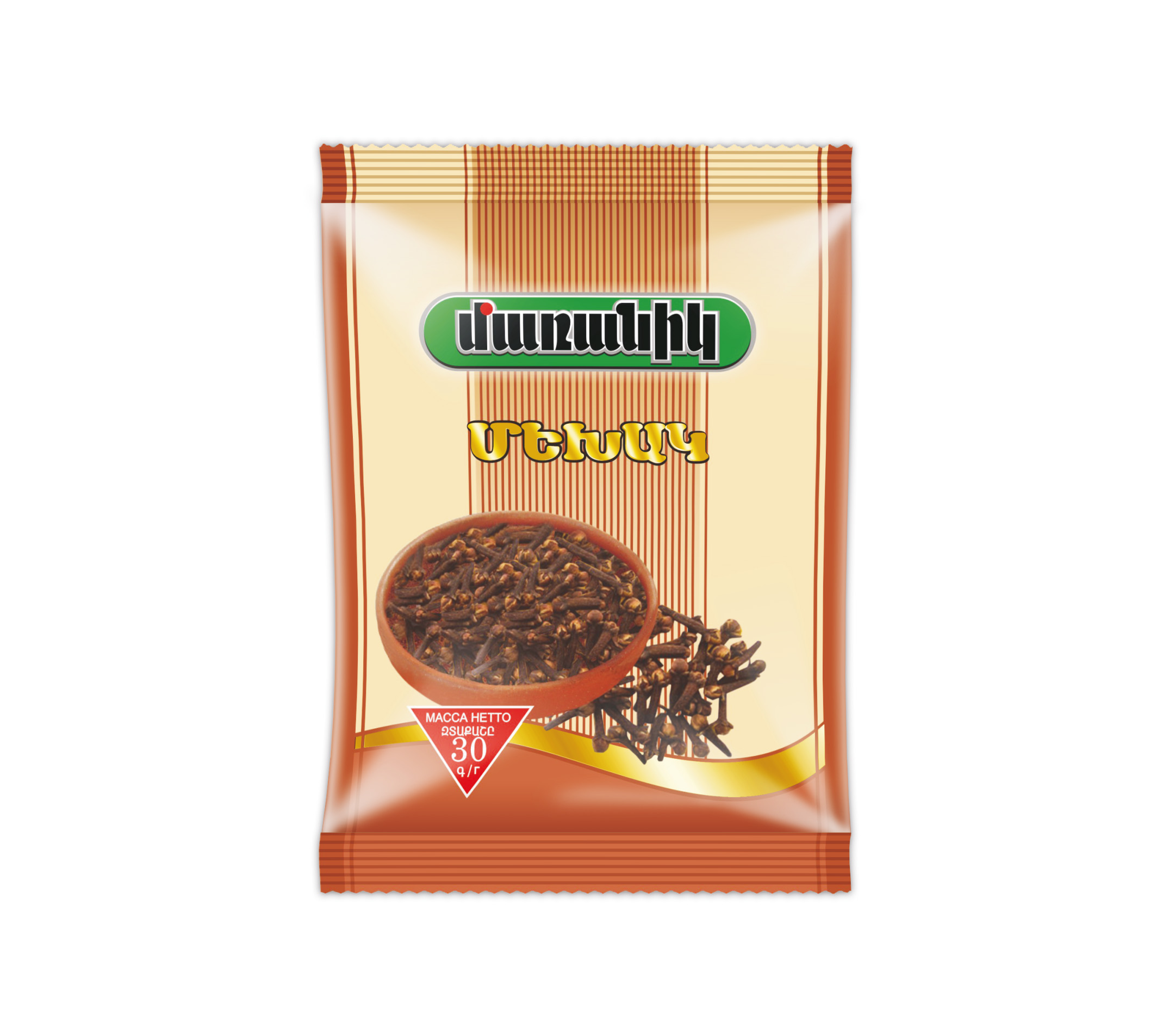 Մեխակ Ծագման երկիրը: Արեւադարձային երկրներ Համային հատկանիշներ: 30գ Ապրանքի նկարագրությունը Մեխակը ունի սուր արտահայտված յուրահատուկ ուժեղ բույր եւ այրող համ:Այն օգտագործվում է հատկապես արեւելյան երկրների խոհանոցում՝ մարինադների,երշիկեղենի,ձկնամթերքի , հրուշակեղենի արտադրության մեջ: