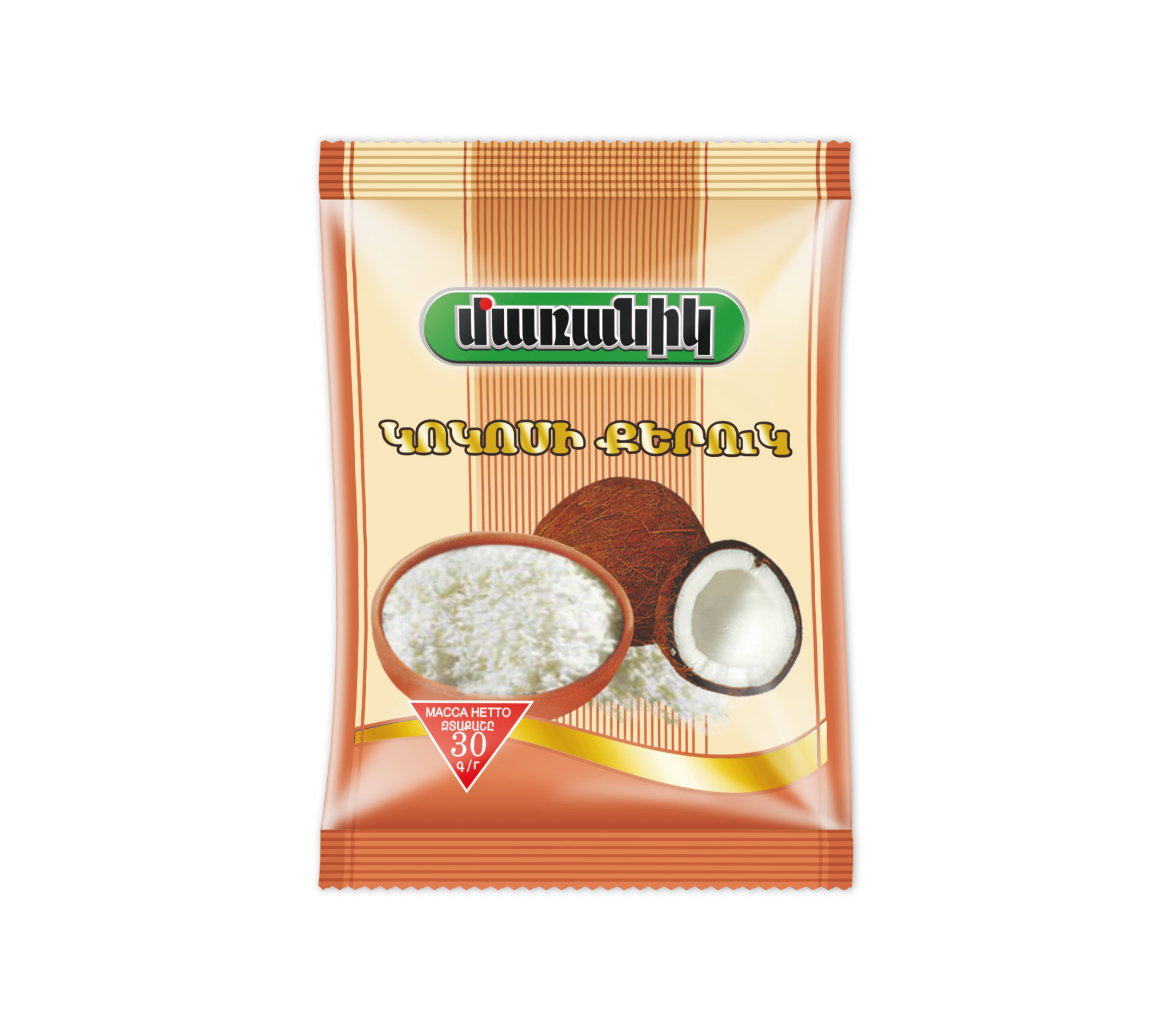 Կոկոս Ծագման երկիրը: Կենտրոնական Ամերիկա Հասանելի քաշ: 30գ Ապրանքի նկարագրությունը Կոկոսի փափուկ եւ սպիտակ միջուկից ստացված քերուկը աչքի է ընկնում հաճելի եւ քաղցր համով:Օգտագործվում է թխվածքաբլիթների, տորթերի եւ բազմազան այլ քաղցրավենիքների պատրաստման ժամանակ:
