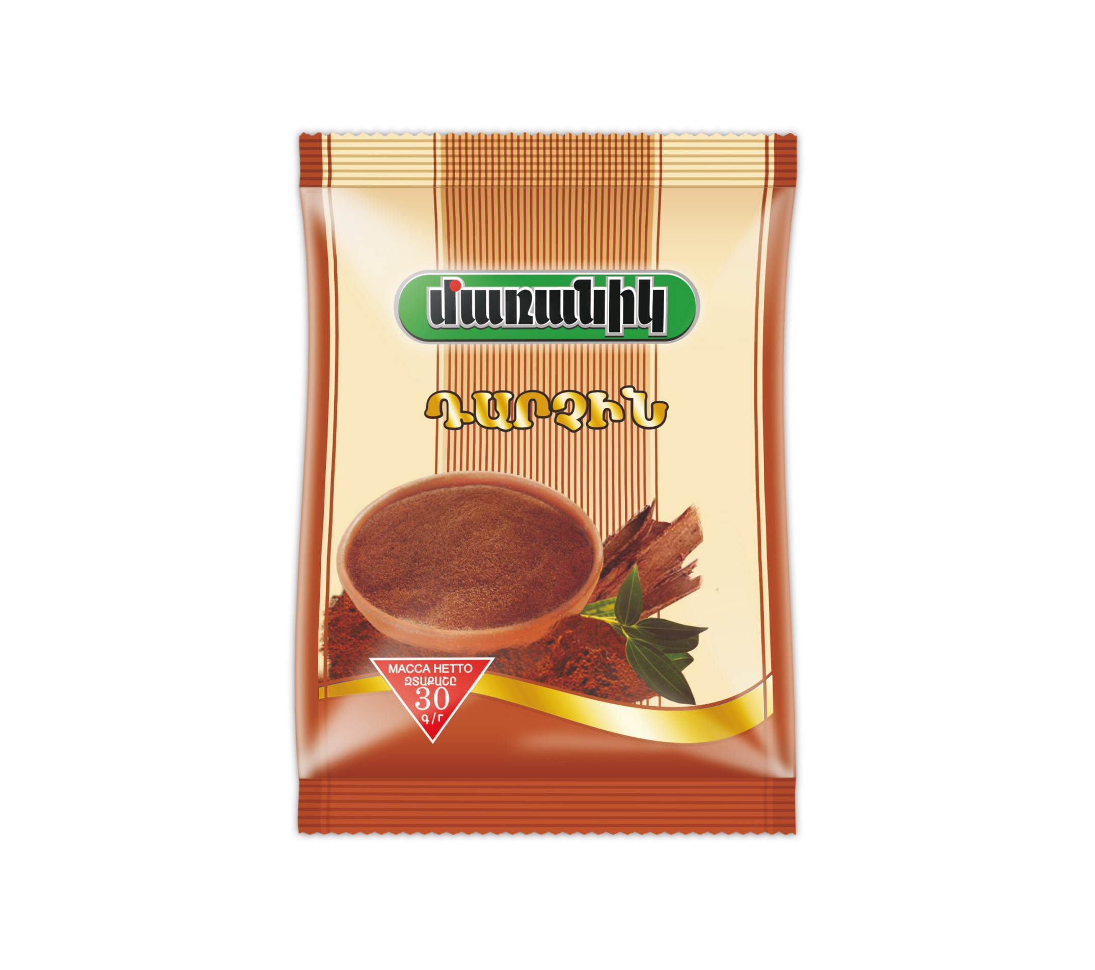 Դարչին Հասանելի քաշ: 30g Ապրանքի նկարագրությունը Դարչինը ունի յուրահատուկ դառնահամ եւ հաճելի բույր: Օգտագործվում է աղանդերի, շոկոլադի, հրուշակեղենի, լիկյորների, ալկոհոլային, տաք ըմպելիքների արտադրության մեջ: