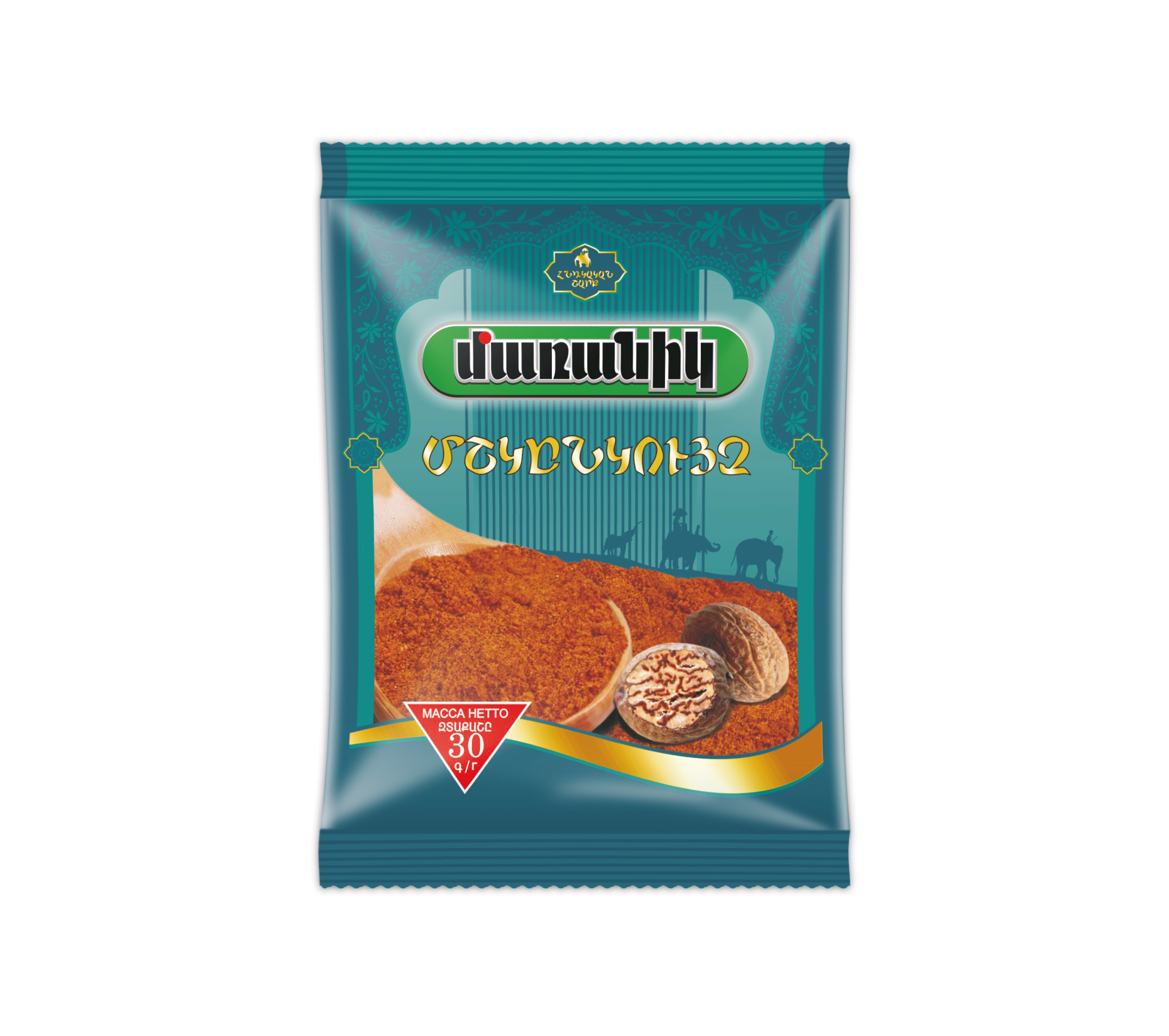 Մշկընկույզ Ծագման երկիրը: Հարավարևելյան Ասիայի երկրներ Հասանելի քաշ: 30գ Ապրանքի նկարագրությունը Մշկընկույզը ունի այրող անուշահոտ համ և յուրահատուկ դառնահոտ:Հիմնականում օգտագործվում է քաղցրավենիքի, բանջարեղենի և մսեղենի հետ: