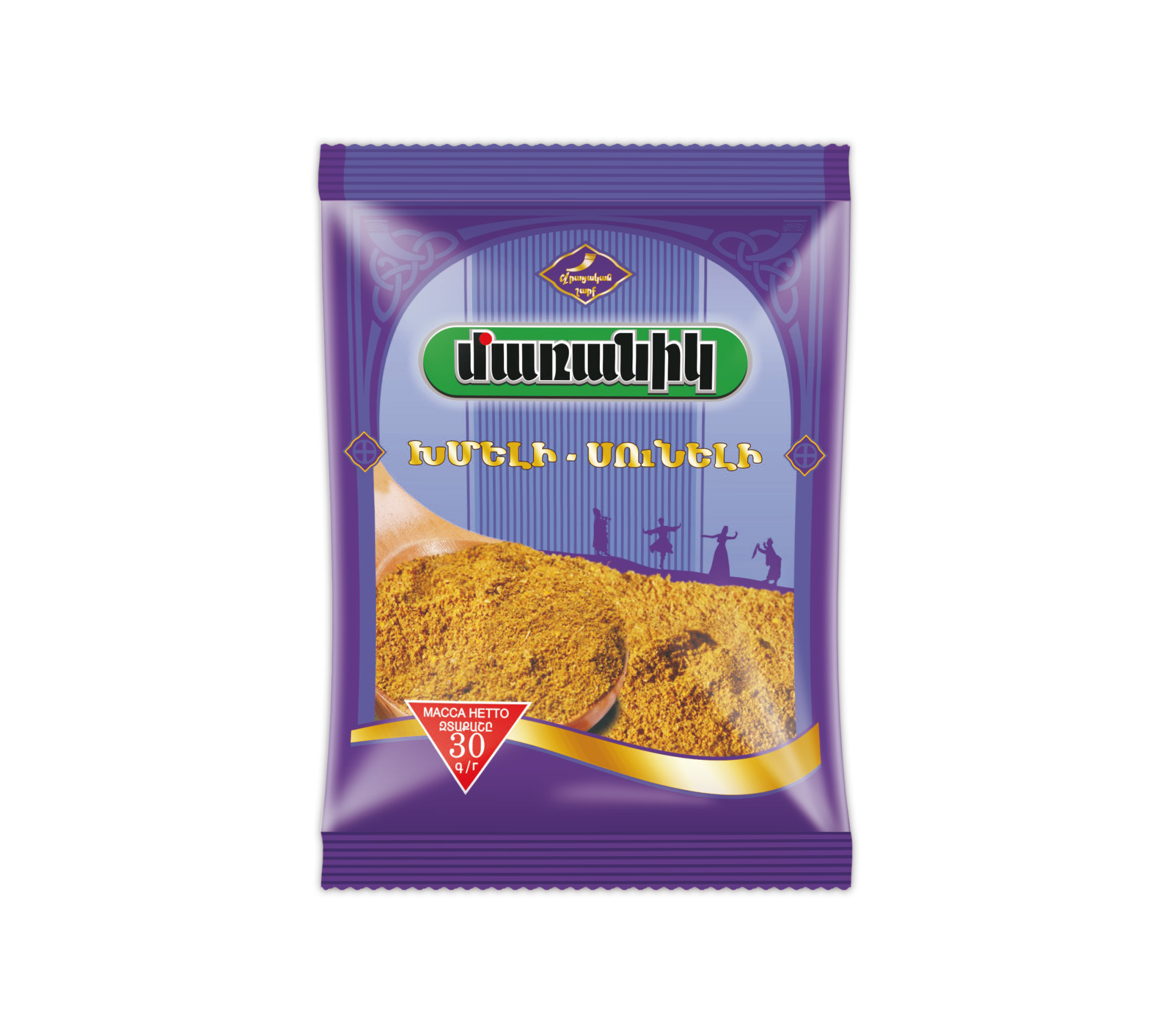 Խմելի-սունելի Ծագման երկիրը: Վրաստան Հասանելի քաշ: 30գ Ապրանքի նկարագրությունը Խմելի սունելին համեմունքներ փունջ է , որը ներառում է չորացրած, մանրացրած ռեհան, կարմիր պղպեղ, մաղադանոս, նեխուր, սամիթ, համեմ, դափնու տերեւ, ուրց, շաֆրան: Այս համեմունքով է պատրաստվում վրացական խարչոն, սացիվին, աջիկան: