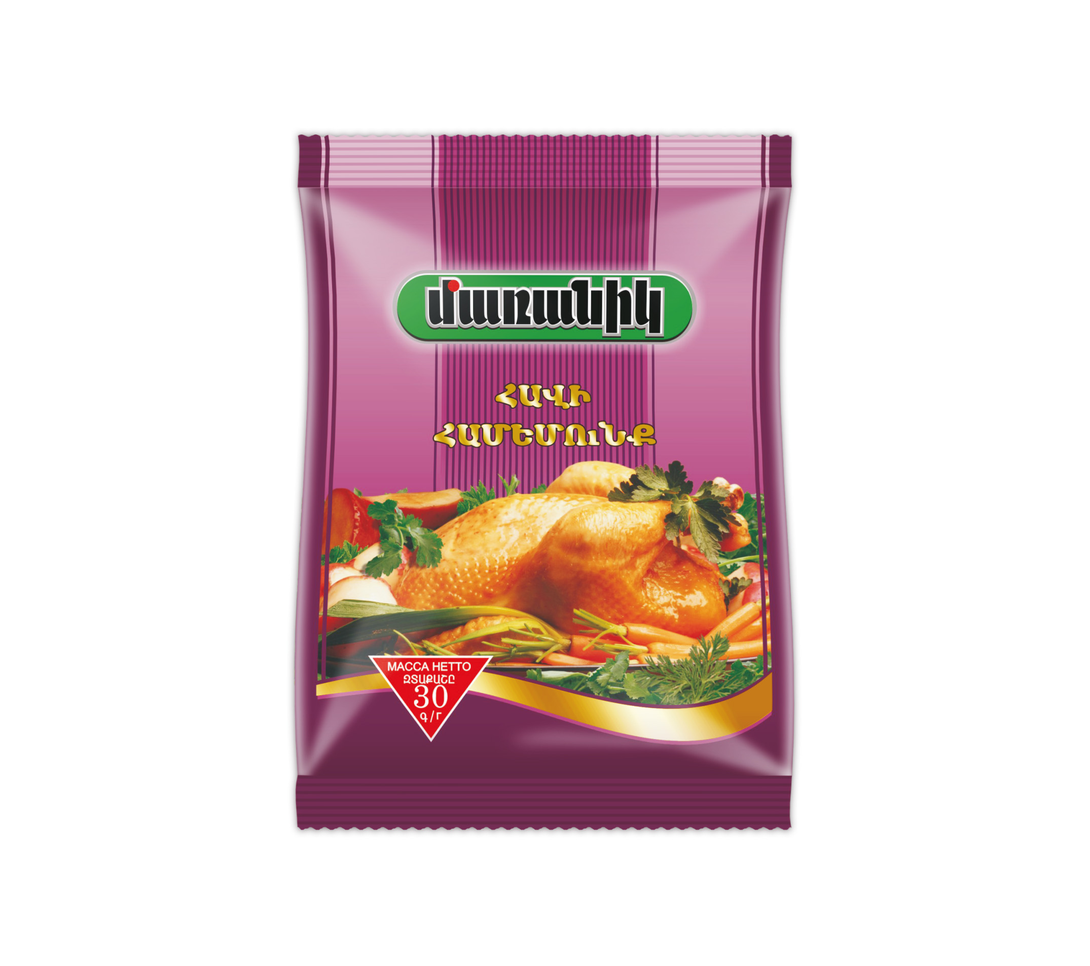 Հավի մսի համեմունք Հասանելի քաշ: 30գ Ապրանքի նկարագրությունը Հավի մսի համար համեմունք՝ նպատակային համեմունքների հատուկ մշակման խառնուրդ: