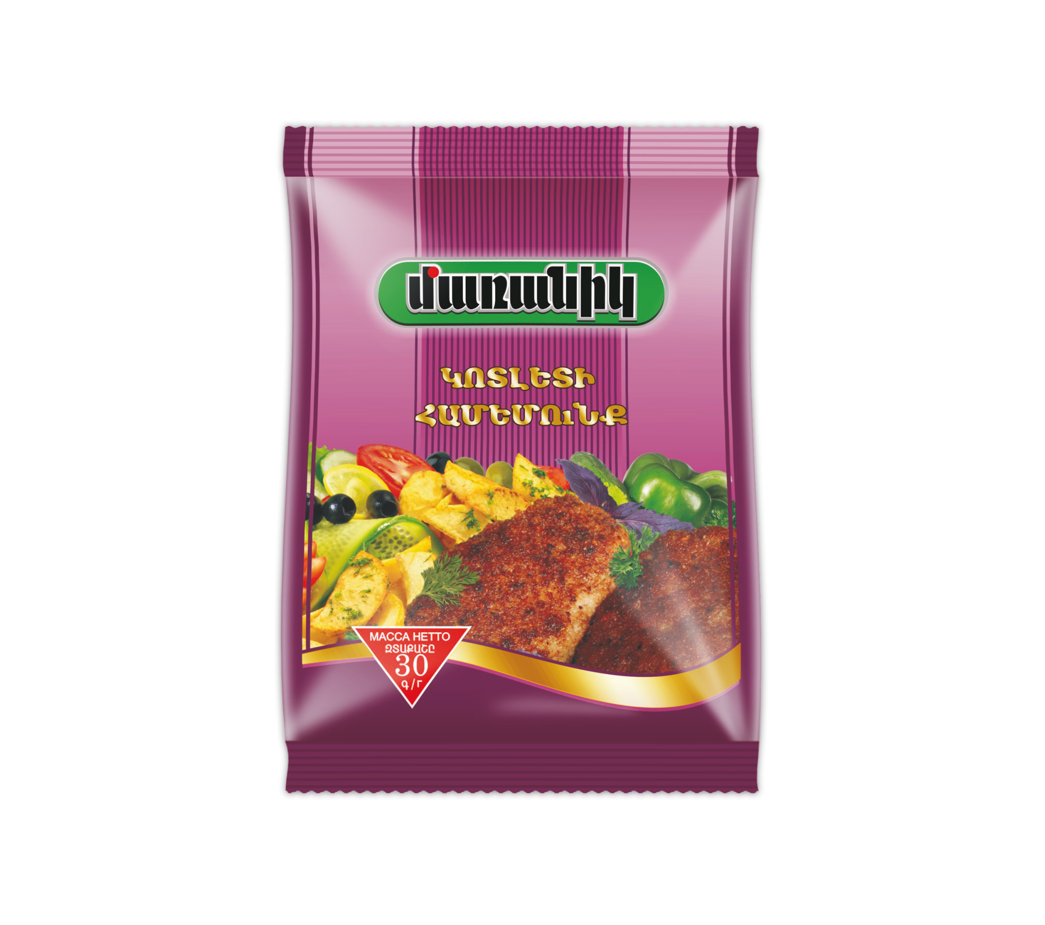 Կոտլետի համար համեմունք Հասանելի քաշ: 30գ Ապրանքի նկարագրությունը Կոտլետի համար համեմունք՝ նպատակային համեմունքների հատուկ մշակման խառնուրդ: