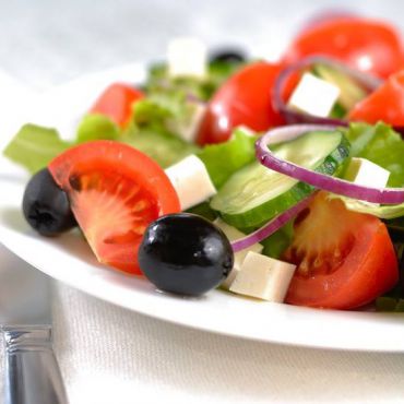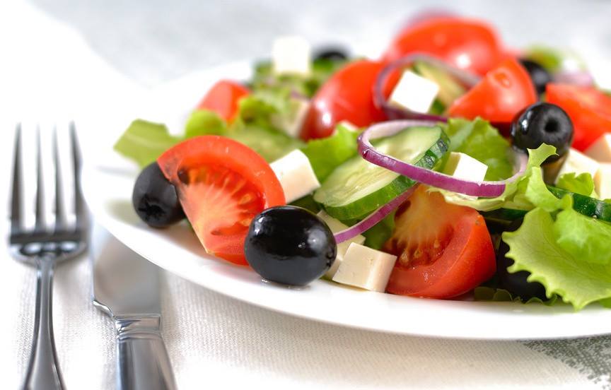 2. Մեծ ամանի լցնել ոչ մեծ կտորների կտրած լոլիկը, կիսակլոր կտրատալ վարունգը, բարակ օղակներով կտրատած կարմիր սոխը, բարակ շերտերով կտրատած կանաչ պղպեղը, խորանարդիկներով կտրատած ֆետա պանիրը եւ ձիթապտուղը: