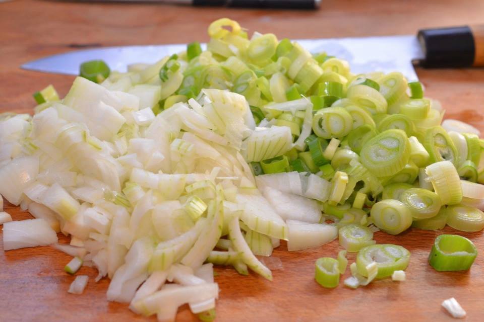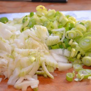 2. Սոխը լվանալ եւ կեղեւահան անել: Կանաչ սոխը մանր օղակաձեւ կտրատել, իսկ գլուխ սոխը կտրատել խորանարդաձեւ: