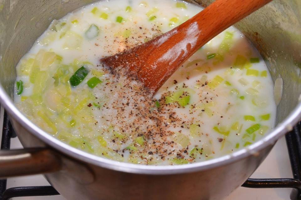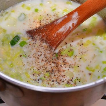 5. Ավելացնել արգանակ, կաթ եւ համեմունքները: Ծածկել կափարիչով եւ թողնել եռա միջին կրակի վրա, մոտ 5 րոպե: