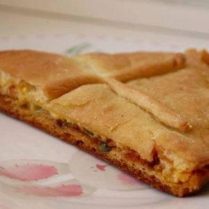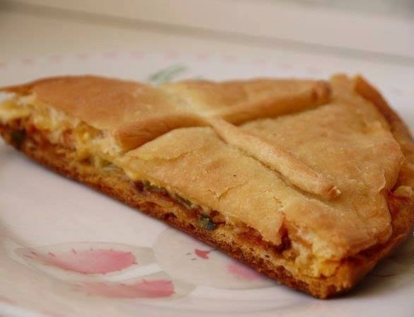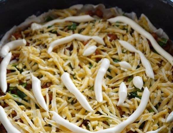 6. Ֆորման բուսական յուղով պատել, մեջը դնել խմորը եւ վրան լցնել մսային խառնուրդը: Շաղ տալ մանր կտրատած կանաչ սոխ: