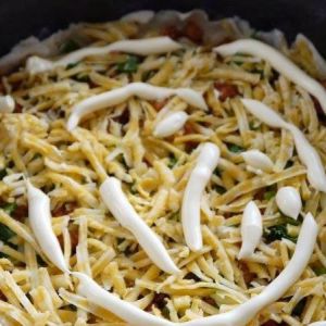 7. Պանիրը քերել եւ ավելացնել կարկանդակի միջուկին եւ մի փոքր մայոնեզ քսել:.
