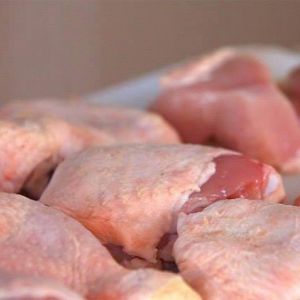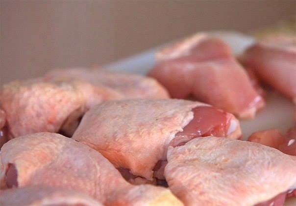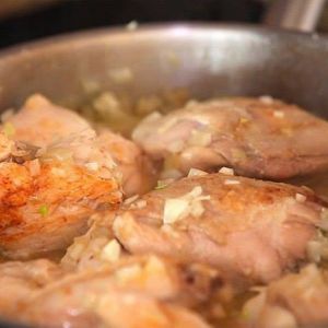 3. Այնուհետեւ ավելացնել փոքր քառակուսիներով կտրատած սոխը եւ հավը այնպես շրջել, որ հայտնվի սոխերի վրա եւ եփել փակ կափարիչով: