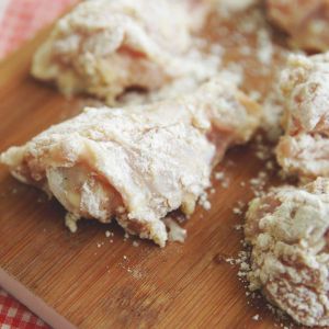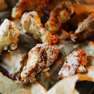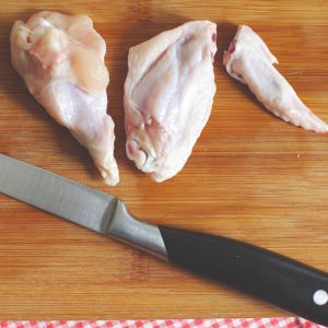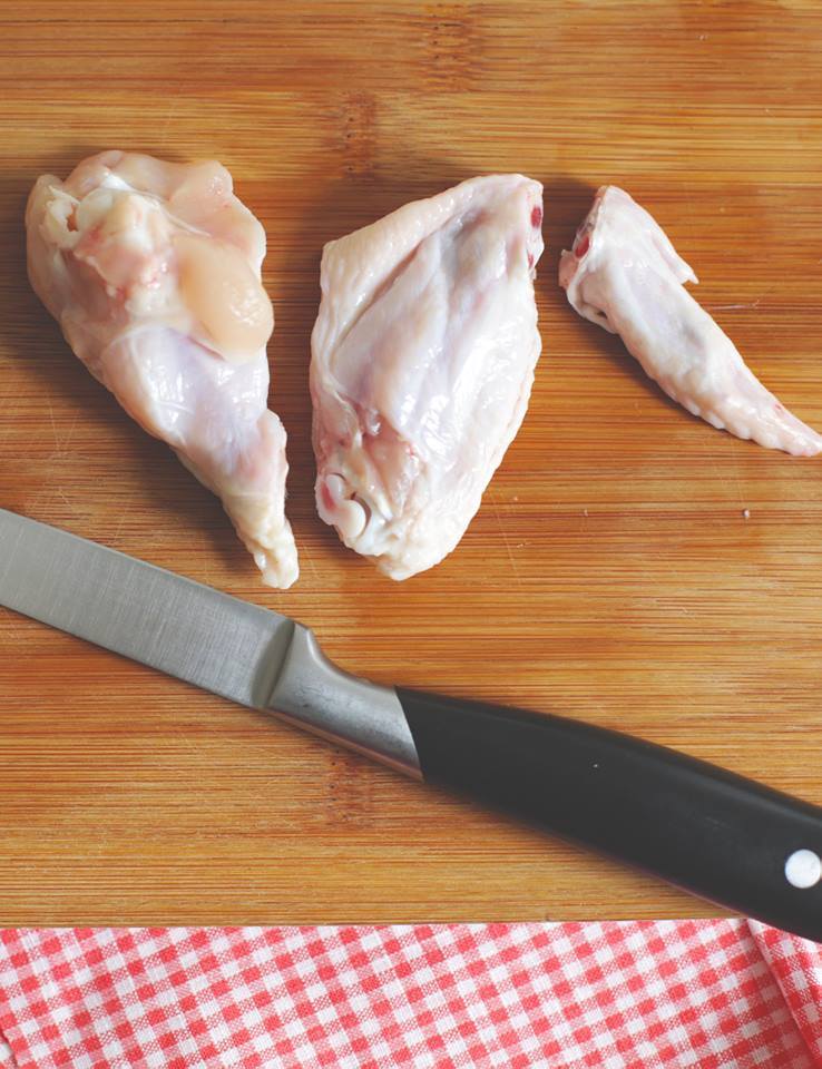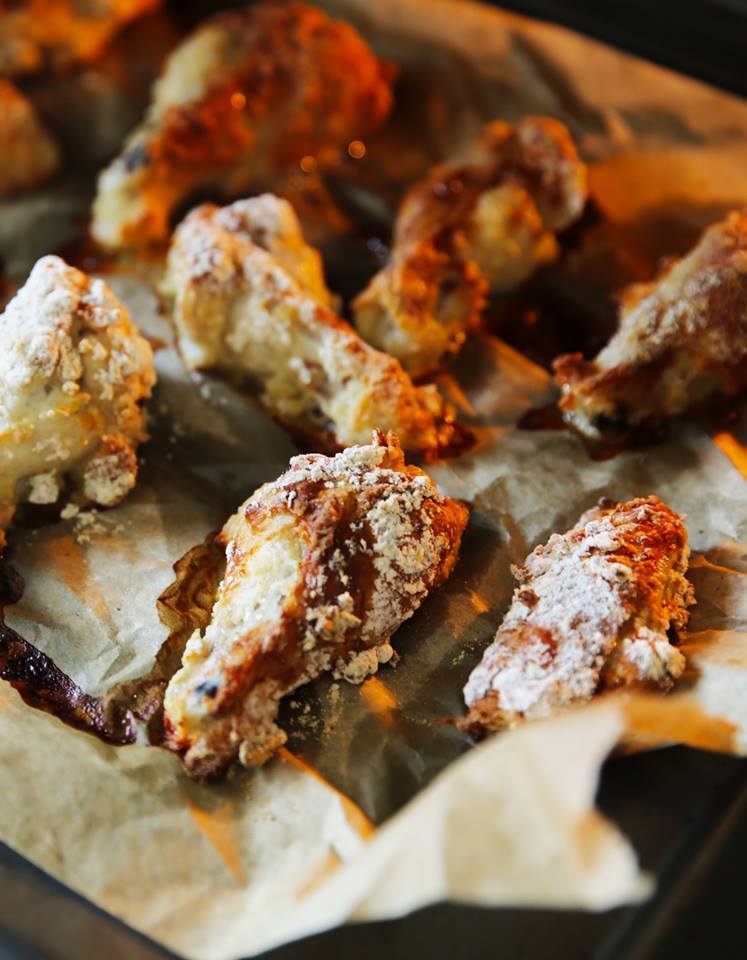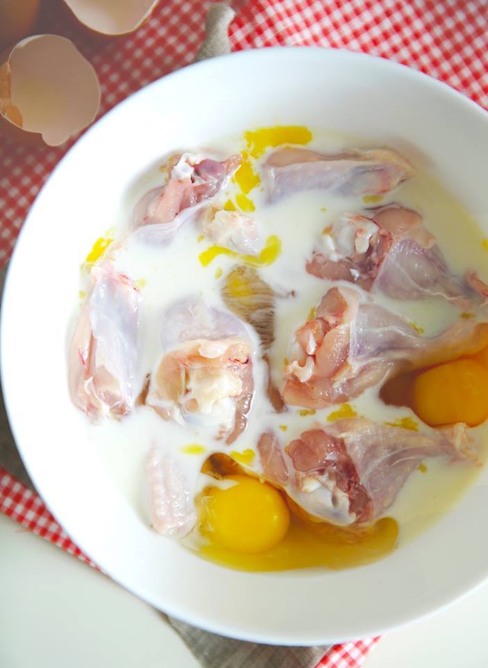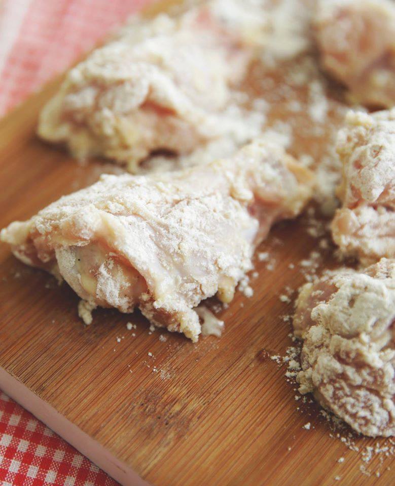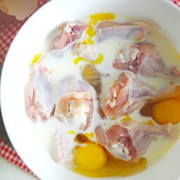 3. Չորացնել հավի թեւիկները: Յուրաքանչյուր թեւիկը թաթախել կաթնաձվային խառնուրդի մեջ եւ ապա թաթախել ալյուրով: