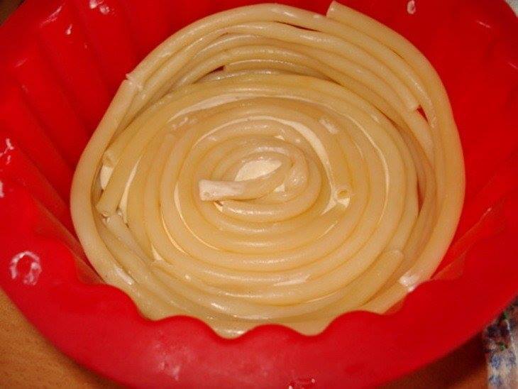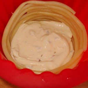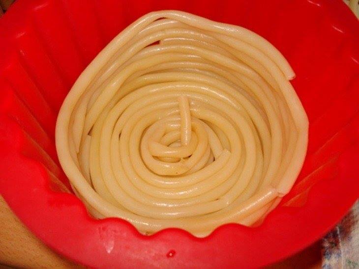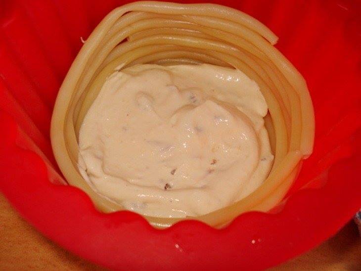 3. Ֆորմայի պատերին կարագ քսել: Հատակին պարույրներով դասավորում ենք մակարոնը: Մեջը լցնում ենք կաթնաշոռի խառնուրդը, ապա նորից պարուրաձեւ մակարոնը եւ նորից կաթնաշոռը: Մակարոնի վերջին շերտը պատում ենք 1 ճաշի գդալ թթվասերով: