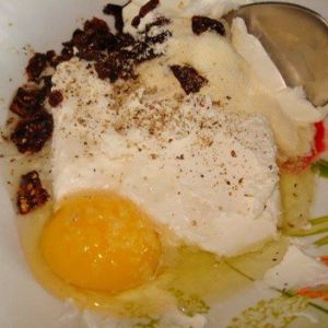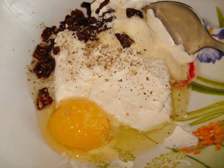 2. Պատրաստենք միջուկը: Կաթնաշոռին ավելացնել ձուն, սպիտակաձավարը, 1 ճ.գ. թթվասեր, աղը, պղպեղը եւ չորացրած լոլիկը եւ խառնել: