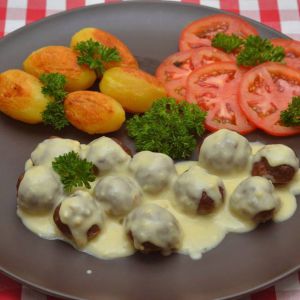 12. Զգուշորեն գնդիկները դնել խորը թավայի մեջ:. Վրան լցնել արգանակի եւ սերուցքի խառնուրդը: Եւս20 րոպե ուղարկել ջեռոցը: