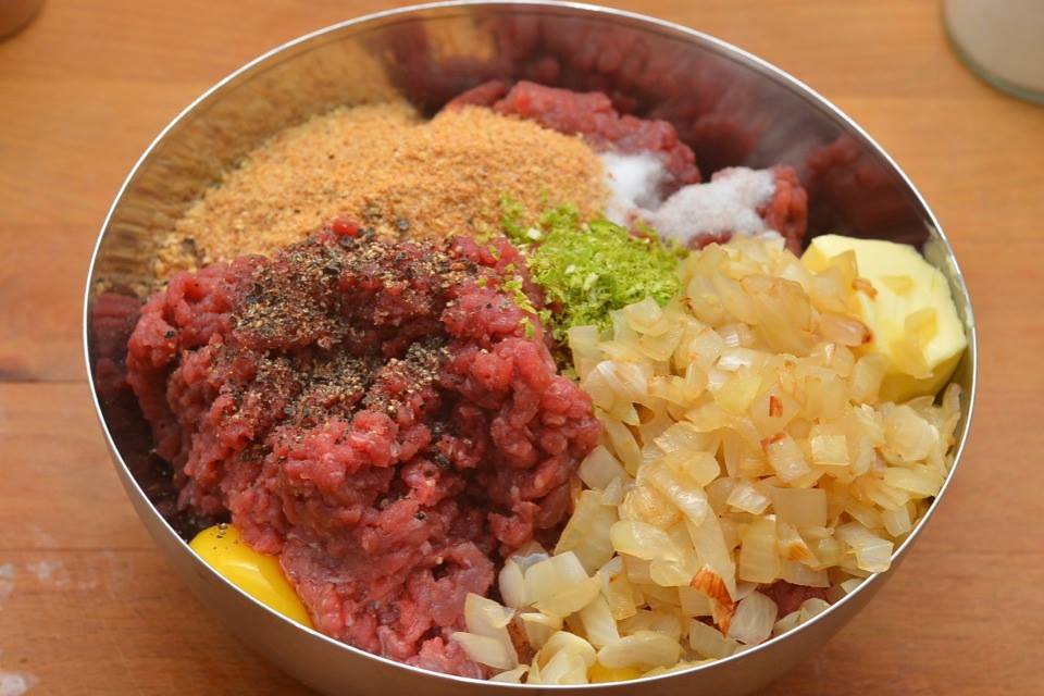 5. Ֆարշի մեջ ավելացնել սոխը, ձուն, աղը, պղպեղը, մշկընկույզը, լիմոնի կեղեւը, հացի փշուրները եւ կարագը: