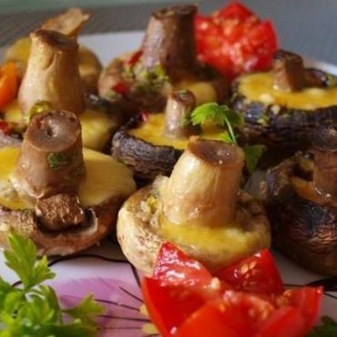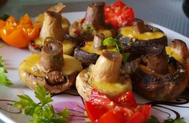 4. Պանիր խորանարդաձեւ կտրատել եւ դնել սնկի գլխիկների մեջ: