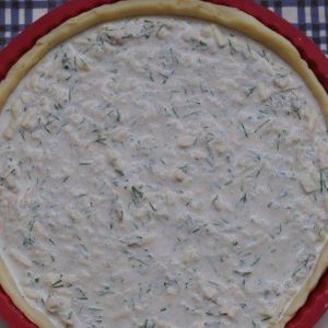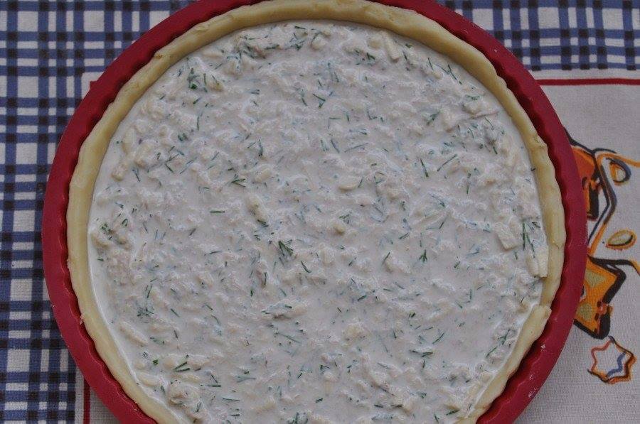 3. Խմորը հանել սառնարանից: Սեղանին ալյուր ցանել եւ խմորը բացել ոչ շատ բարակ: Դնել ֆորմայի մեջ եւ ավելորդ ծայրերը կտրել մկրատով: Մի քանի րոպե դնել սառնարանը: