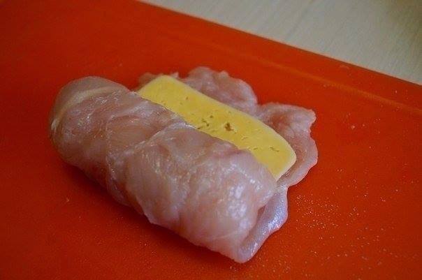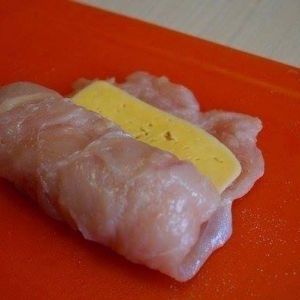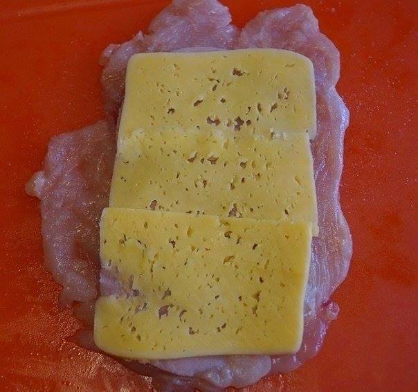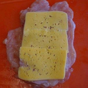 2. Յուրաքանչյուր շերտը առանձին ծեծել: Ավելացնել մի քիչ աղ: Յուրաքանչյուր կտորի վրա դնել 2 կտոր խոզապուխտ: Խոզապուխտի վրա դնել պանիրի շերտեր: Ռուլետաձեւ պտտել: