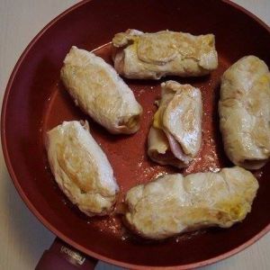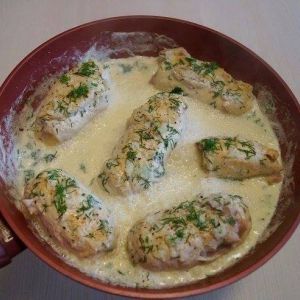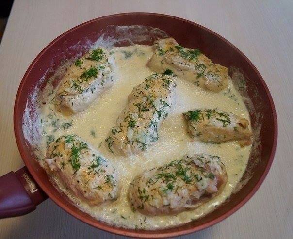 4. Թավայի վրա տաքացնել բուսական յուղը: Ռուլետները դնել թավայի մեջ: Տապակել բոլոր կողմերից մինչեւ ոսկեգունի: Թավայի մեջ լցնում ենք սերուցքը: Ճզմում ենք սխտորը: Պղպեղ՝ ըստ ճաշակի: Շաղ տալ կանաչեղենը: