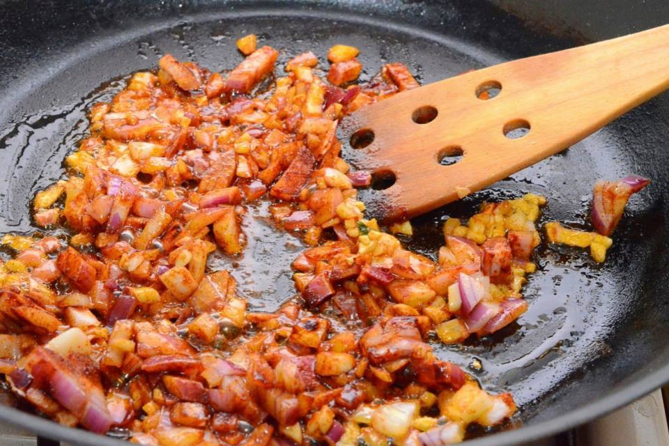 5. Ձիթապտղի յուղը տաքացնել թավայի մեջ: Լցնել սոխը, սխտորը եւ կարմիր պղպեղը: Լավ խառնել.