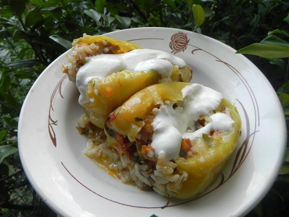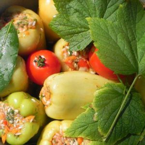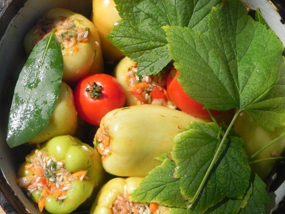 - Stuff peppers and put those into a boiler, add bay leaves. wrap peppers by grape leaves, Add boiled water and 2 spoons of a vegetable oil, cook from 40-45 minutes after boiling