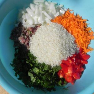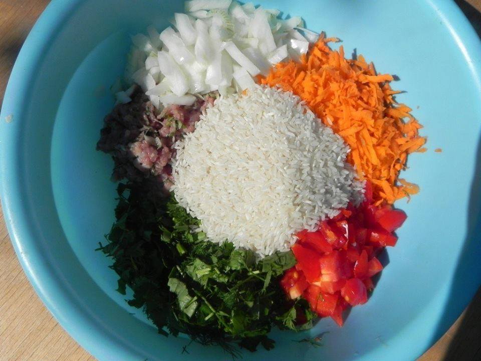 - Clean peppers, mix meat, vegetables and greens, add butter, salt, pepper, 2 spoons of sauce
