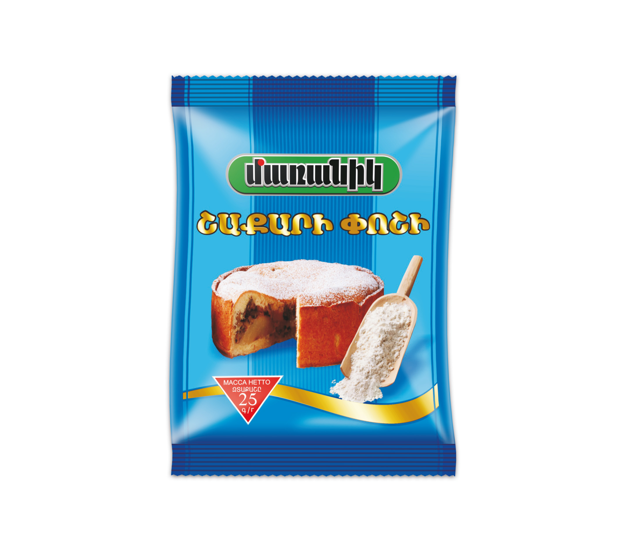 Сахарная пудра Страна происхождениея: Армения Доступный вес: 25 гр Описание продукта Сахарная пудра — тонко измельчённые кристаллы сахорного песка размером не более 0,2 мм. Пудра используется в приготовлении кондитерских изделий (например глазури), для посыпки выпечки.