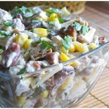 Петрушку помыть, высушить и мелко нарезать. В тарелке смешать куриное филе, вареный фасоль, сыр, кукурузу, соленые огурцы, петрушку и сухари черного хлеба, добавить майонез и перемешать.
